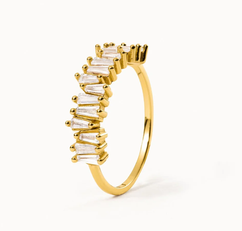 Zeit zu glänzen! Der Crystal Dust Ring verzaubert mit seinen asymmetrisch angeordneten, strahlenden Zirkonia-Steinen, die dem Design eine moderne, außergewöhnliche Note verleihen. Jeder Blickwinkel offenbart ein neues Lichtspiel – perfekt für alle, die subtilen Glamour lieben.