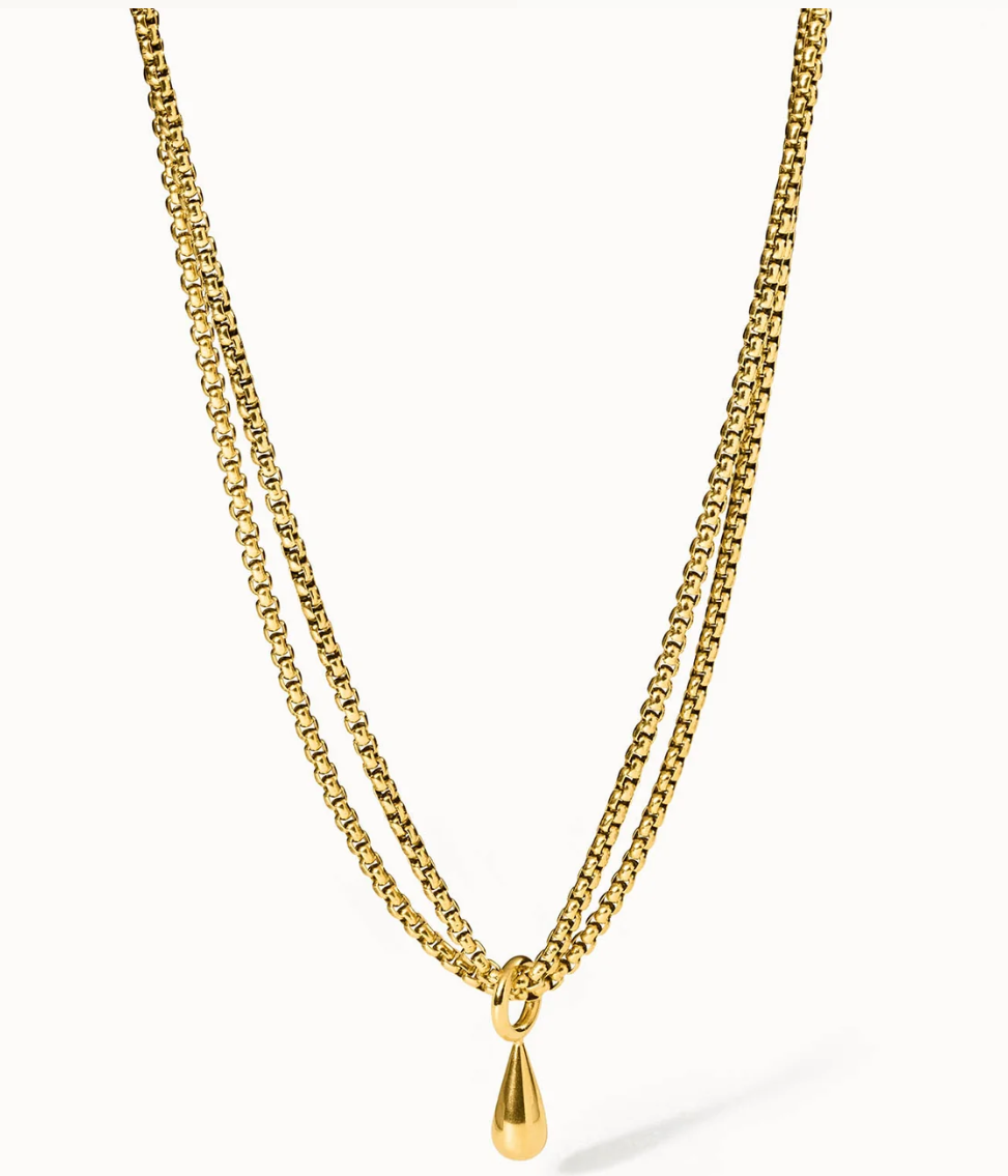 Die Waterdrop Kette vereint modernes Design mit einem Hauch von müheloser Leichtigkeit. Ihre doppelte Kettenstruktur besteht aus feinen, ineinandergreifenden Gliedern, die bei jeder Bewegung sanft schimmern und so einen besonders edlen Look erzeugen.
